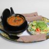 Seasoned mild chickpea powder cooked with onion, garlic, tomatoes, beef and served with a side of salad.